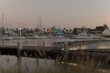 Sunset over residential development by water in Ventura California with modern homes and yachts boats