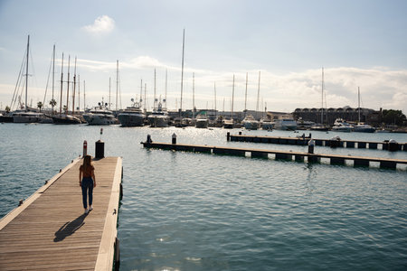 Young pretty woman looking at the beautiful sailing boats in port of Valencia, Spain
