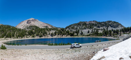 Lassen NP, CA - July 14, 2022: View of Lake Helen and surrounding peaks and formations
