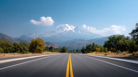 A stunning view featuring a wide highway leading towards a majestic snow-capped mountain. Surrounded by lush trees and a clear blue sky, this serene landscape invites exploration.