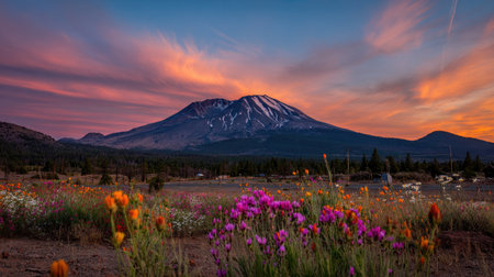 Breathtaking landscape featuring a mountain range at sunset, with a vibrant meadow of wildflowers in the foreground. The colors of the sky and flowers create a stunning display of nature's beauty.