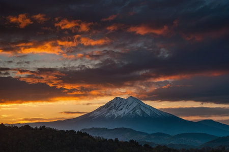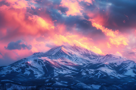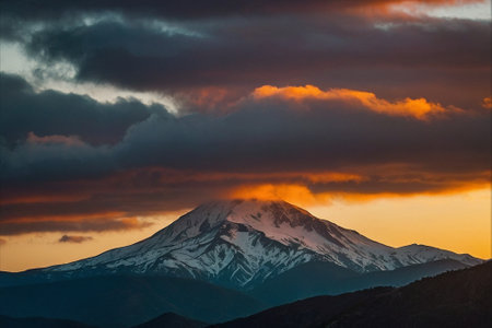 Dramatic clouds cast a warm light onto a snow-capped mountain peak, creating a scenic view ideal for adventure and travel concepts.