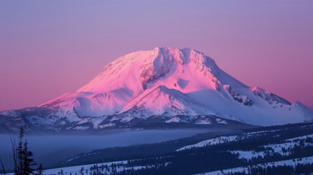 Panoramic view of a majestic snowy mountain peak illuminated by the soft pink hues of sunrise