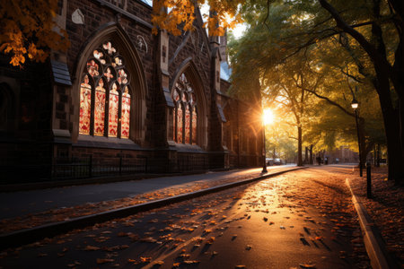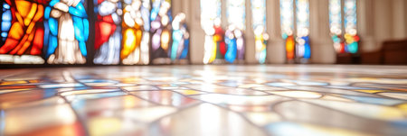 Sunlight pours through intricate stained glass windows, filling the beautiful church interior with an enchanting glow. The majestic space.