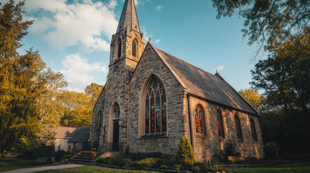 Old stone church with a tall spire and stained glass windows, a symbol of faith and history.