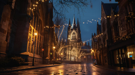 Illuminated Neo-Gothic Cathedral Facade, Majestic Architecture, Night Cityscape Landmark