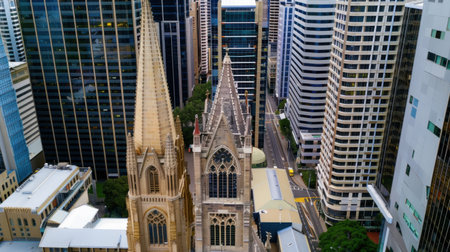 An aerial photograph showcasing a historic cathedral with spires nestled amidst modern skyscrapers, creating a striking contrast in an urban environment.