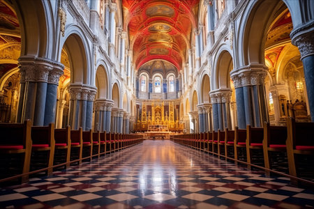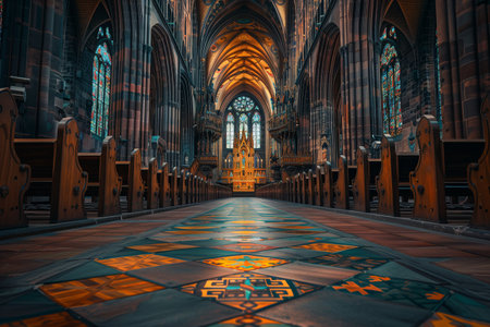 Majestic cathedral interior with high ceilings and intricately stained glass windows. Historical and religious architecture