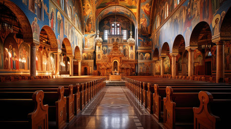 Majestic Church Interior with Stunning Stained Glass Windows and Intricate Wooden Pews. Concept of Sacred Architecture, Spiritual Atmosphere, Historical Heritage, and Religious Artistry.