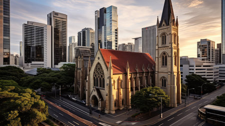 High angle view of church in sunny 18th century city square, created using generative ai technology. Historical architecture, landmarks and city planning concept digitally generated image.