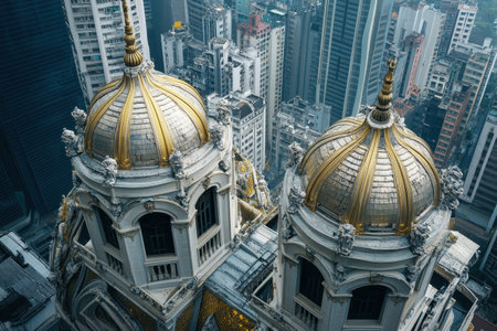Two beautifully designed domes with golden details rise above a crowded cityscape, showcasing a blend of historic architecture and contemporary buildings in the background.