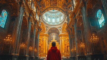 Warm candlelight illuminates the golden altar and stained glass windows of a church, creating a spiritual atmosphere. Ai generative