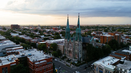 Drone flight above the Roman Catholic Saint-Edouard Church in Montreal at sunset, Quebec, Canada