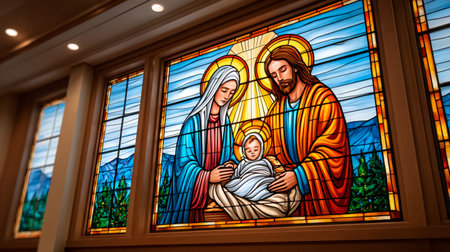 Stained glass window representing the holy family in a church, depicting the nativity scene