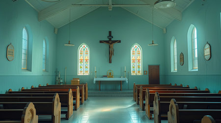 A beautiful church with stained-glass windows depicting the life of Jesus, creating a peaceful Christian atmosphere