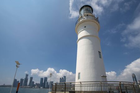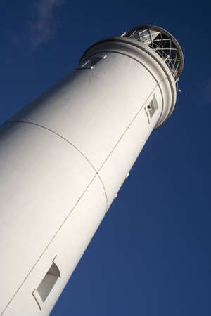A beautiful tall white lighthouse on the blue sky background. Cape Egmont Lighthouse, New plymouth, New Zealand.