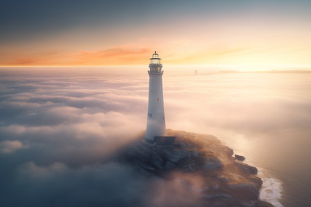 Majestic Lighthouse Standing Tall on Rugged Cliffs, Guiding Ships Through Foggy Seascape at Dusk