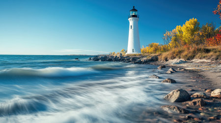 A lighthouse overlooks the calm lake water with gentle waves lapping at the rocky shore. Colorful autumn foliage adds vibrancy to the scene under a bright blue sky