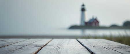 AI Generated. close up of empty wooden table with blurred lighthouse on shore background