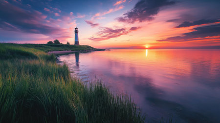 Coastal sunrise with calm, glassy sea surface, a classic lighthouse along the green shore, and colorful dawn skies in a peaceful landscape.