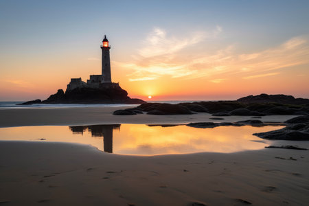 lighthouse reflection on calm seaside during twilight, created with generative ai