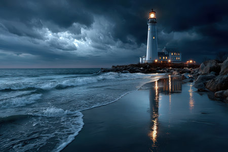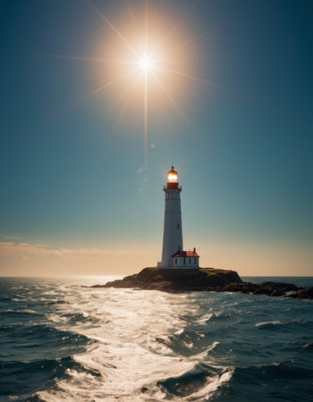 A majestic lighthouse stands tall against the vast ocean, its beacon of hope guiding ships through stormy seas This timeless maritime symbol, a guardian of coastal shores, inspires seafarers and protects those who navigate the waters Its unwavering presence is a testament to the enduring spirit of human resilience and the power of light in the face of darkness AI Generative