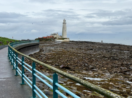 St. Mary's Lighthouse with basalt path at low tide with promenade along the English coast. Light blue retro, antique, art deco cast iron handrail. Whitley Bay, Newcastle, UK. High quality photo