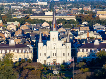Aerial view of Jackson Square with Saint Louis Cathedral church and surrounding extant historical buildings from French Quarter in morning. The historic district section of the city of New Orleans.