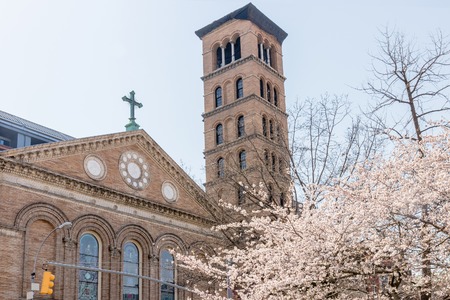 NEW YORK, USA - APRIL 14, 2018: The Judson Memorial Church located opposite Washington Square Park, in the Greenwich Village neighborhood of the New York City borough of Manhattan
