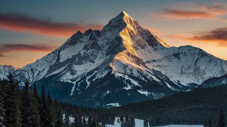 A majestic mountain peak covered in snow stands tall under a colorful twilight sky with evergreen trees in the foreground Great for scenic backgrounds.