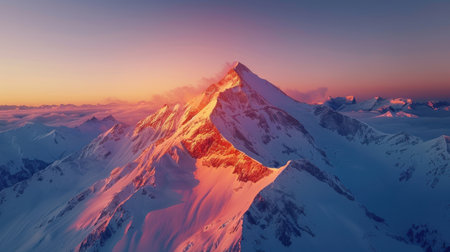 Majestic snow-covered mountain peak glows during sunrise or sunset, with a clear sky backdrop ideal for nature and travel concepts.