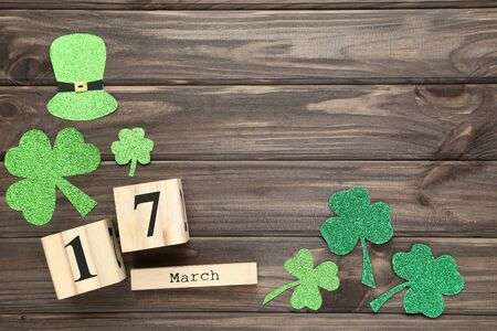 St.Patrick's Day. Paper clover leafs with cube calendar on wooden table