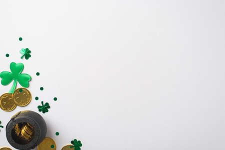 Top view photo of the one black cauldron with golden coins inside and around green confetti different size and shades in shape of clovers and dots on the white isolated background blank space