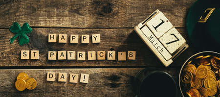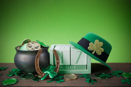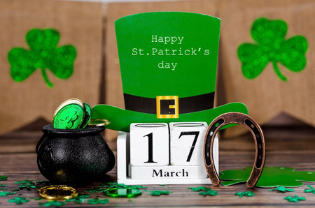 Background for St. Patrick's Day, March 17, with a lucky horseshoe, a leprechaun hat, a clover and a pot of gold on a wooden background.