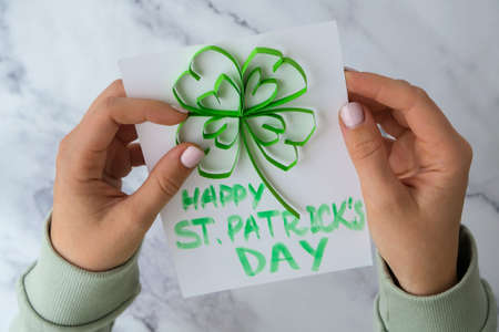 Diy St. Patricks Day greeting card made of Quilling and paper clovers on white background. Gift idea, decor Spring, happy Patrick Day. Step by step. Top view. Process kid children craft. Do it yourself