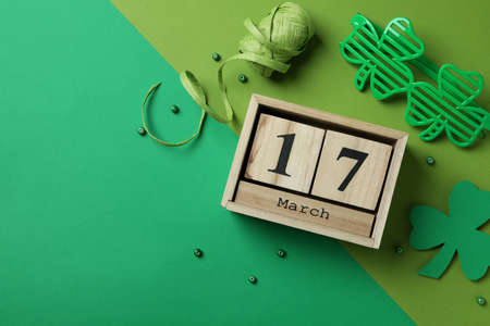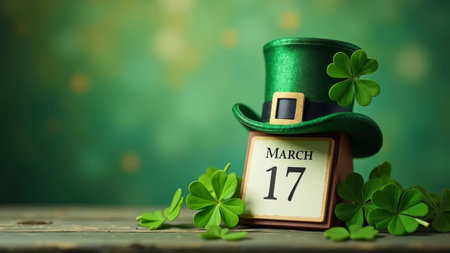 St Patrick's Day background with green leprechaun hat, calendar and clover leaves.