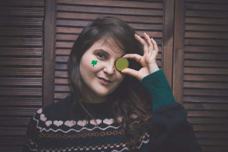 young beautiful woman with painted green clover on her cheek holding golden coin at the bar in front of a wooden wall