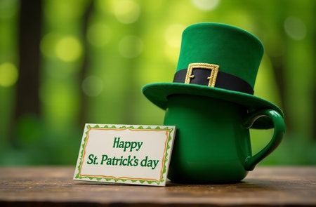 AI Generative St. Patrick's Day postcard leaning against an Irish hat on Green Background