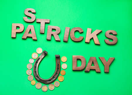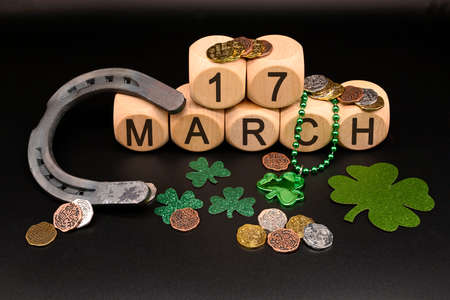 Concept of St. Patrick. green necklaces and clovers, horseshoes, lucky coins and dice with letters March 17, St. Patrick's Day on black background