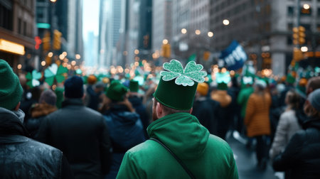 A man wearing a green hat with a shamrock on it stands in a crowd of people. The crowd is large and diverse, with people of all ages and backgrounds. The atmosphere is lively and festive