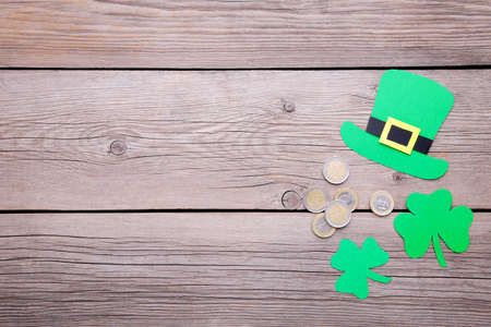 Happy St. Patricks day. Shiny shamrocks, gold coins and leprechaun hat on a wooden background
