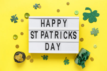 Board with words HAPPY ST PATRICKS DAY, gift box and decor on yellow background