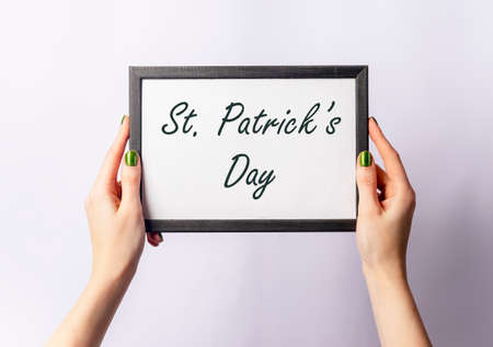 Female hands with green nails holding St Patrick's day inscription on paper in frame