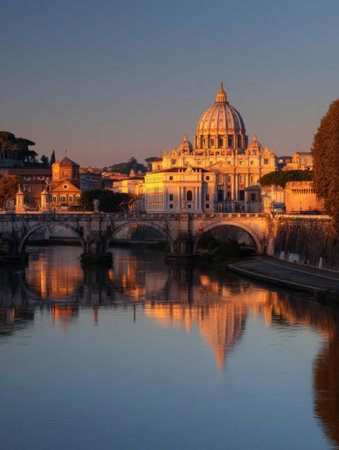 Golden evening light illuminates the dome of St. Peters Basilica, casting a picturesque reflection on the tranquil waters of the Tiber River.