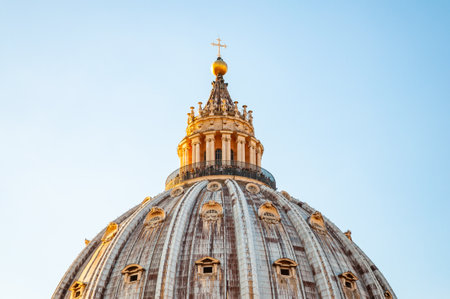 Vatican, Rome, Italy - November 16, 2018: The dome of the Papal Basilica of St. Peter in the Vatican or simply St. Peter's Basilica. Sunlight illuminating the top of the dome with highest viewpoint