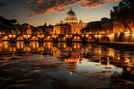 Illuminated St. Peters Basilica in Vatican City with the glowing Ponte SantAngelo bridge reflecting in the Tiber River at night, symbolizing faith, history, and timeless Roman beauty