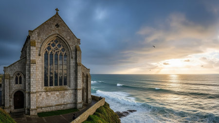 Panoramic view of the ocean and the Church of St. Francis of Assisi at sunset, Cornwall, UK
