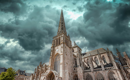 TREGUIER, COTES D'ARMOR, BRITTANY, FRANCE, MAY 20, 2025: exteriors architectural details of cathedral Saint Tugdual