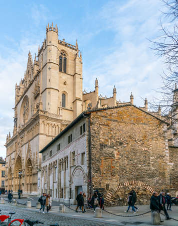 Lyon, France 3rd January 2020 - tourists visiting the Cathedrale (Cathedral) of Saint-Jean-Baptiste in the old part of Lyon