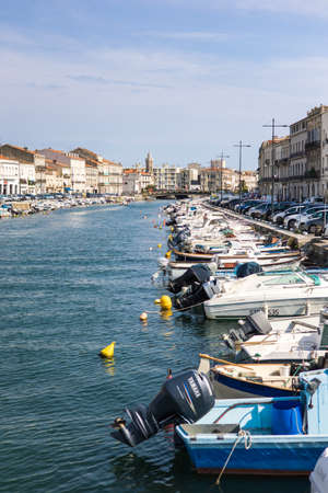 Saint Gilles Croix de Vie, France - September 16, 2018: rear view of a ferry leaving the port towards the island of Yeu on a summer day
